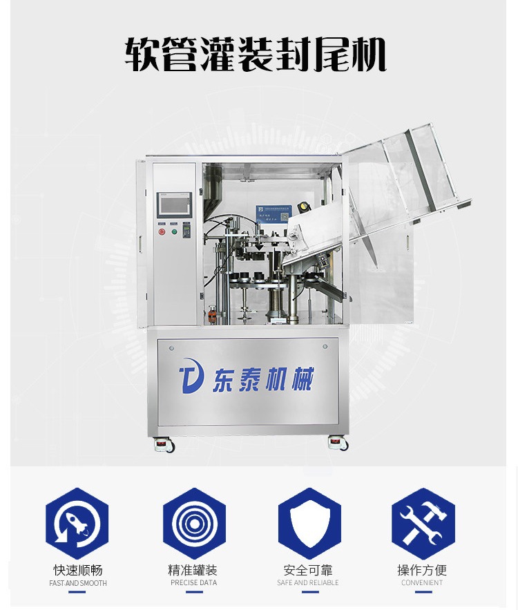 1.適用于醫(yī)藥、食品、化妝品、日用化工等行業(yè),對(duì)復(fù)合管,塑料管,鋁管進(jìn)行灌裝封尾??蓪⒏鞣N糊狀、膏狀、粘度流體等物料順利準(zhǔn)確地注入軟管中,并完成封尾和打批號(hào)、