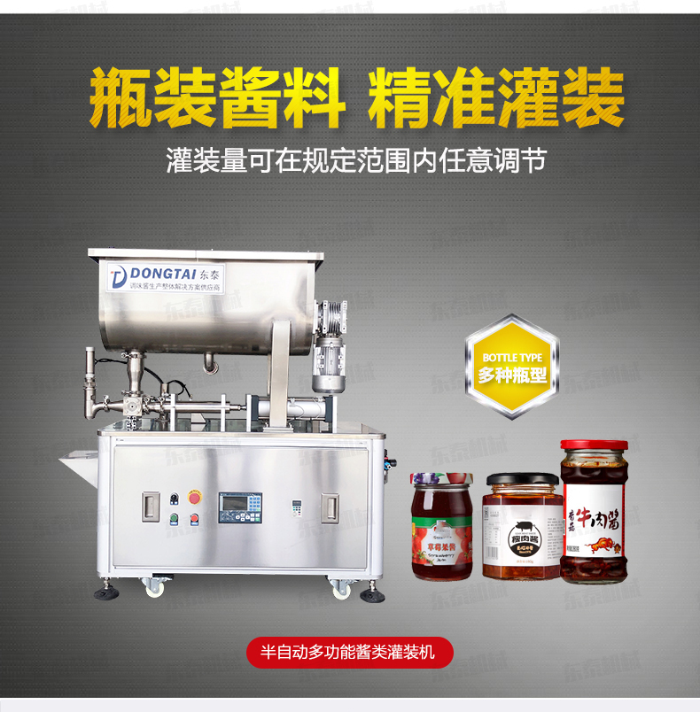 這款辣椒醬灌裝機是我公司結合自身十幾年的生產經驗,加之灌裝機技術,進行設計的產品,其結構更加簡單、操作更加簡便。小型辣椒醬灌裝機可灌裝顆粒漿狀流體物料,特別適用于調味品中帶顆粒并且濃度較大的辣椒醬、火鍋底料等粘稠醬類的灌裝,配置的自動攪拌器,保證了醬和油的充分混合,又稱為辣椒醬灌裝機、花生醬灌裝機、豆瓣醬灌裝機、果醬灌裝機,芝麻醬灌裝機、粘稠醬類灌裝機、牛肉醬灌裝機